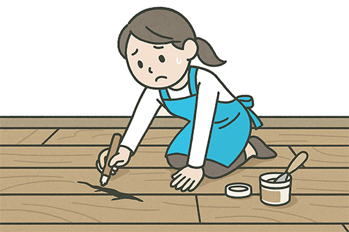 フローリングのリペアは、依頼が多い工事の一つです。フローリングリペアで対応可能な損傷には、小さな傷、へこみ、焦げ跡などがあります。これらは専用パテで滑らかに埋めた後、不自然にならないよう着色し、木目などを再現します。
