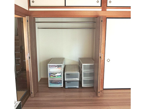 和室の押し入れは奥行きが深く、布団収納には適しているものの、衣類の収納には使いにくいと感じる方も多くいらっしゃいます。中段や枕棚を撤去し、ハンガーパイプを設置することで、衣類を掛けて収納できるクローゼットへと変更しました。