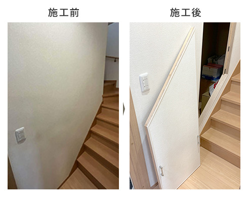 これまでなかなか活用できなかった階段下のスペースを有効利用することで、見落とされがちな収納不足を解決します。嵌め込み式の扉を設けることで、開閉スペースを気にすることなく収納可能に。