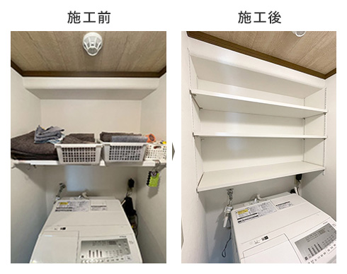 洗濯機上の空間は空きがちなスペースですが、可動棚を設置することで実用的な収納場所へと変わります。棚の高さを調整できる仕様にすることで、タオルや洗剤など、収納する物に合わせた使い方が可能です。