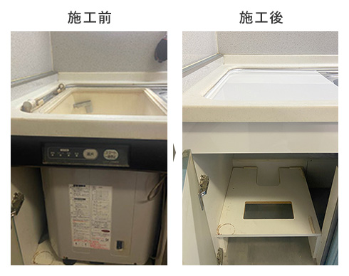 故障やライフスタイルの変化により使わなくなったビルトイン食洗機を撤去し、そのスペースを収納庫として再活用しました。デッドスペースになりがちな設備部分を、実用的な収納へと転換しています。