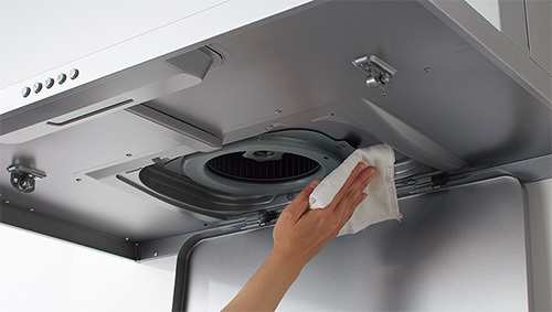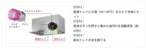 洗エールレンジフードは、トレイにお湯を入れて洗浄ボタンを押すだけでフィルターとファンをまるごと自動洗浄できます。